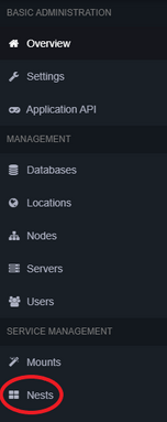 The Pterodactyl panel nests button in the administrative section. - You will be greeted with the following list (or similar looking list). Click