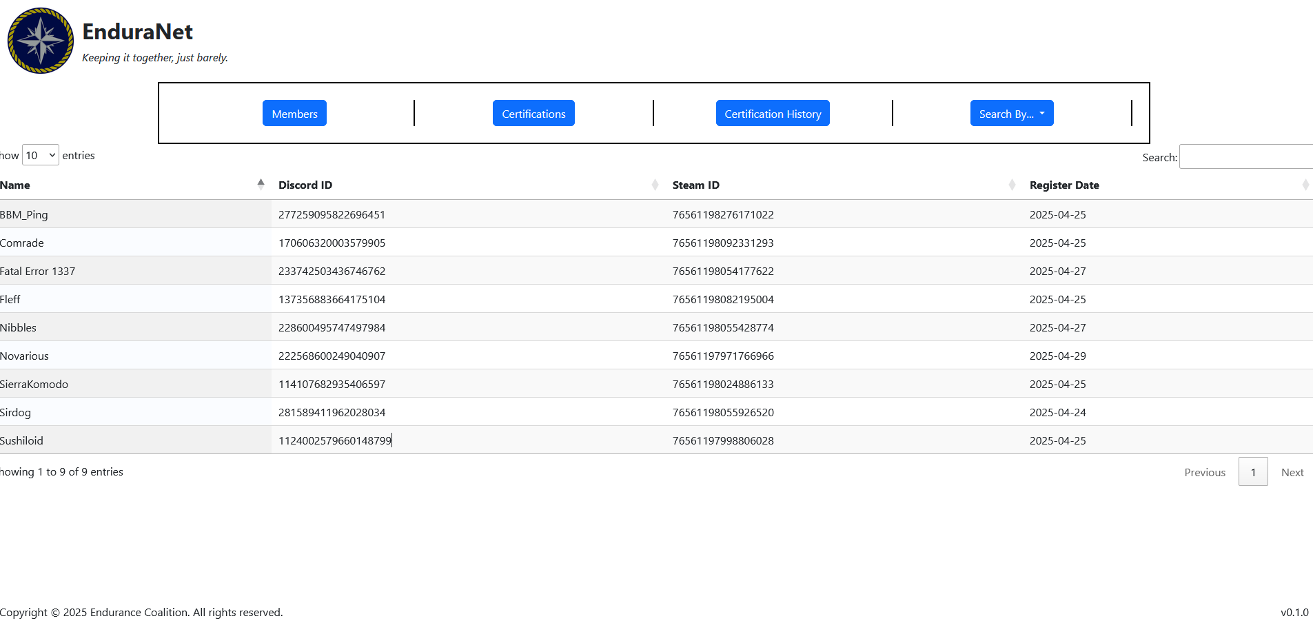 | 20:46, 7 May 2025 | Enduranet logo.png (file) | 4.46 MB | Sirdog (talk | contribs) | The official logo of EnduraNet, the database front-end for EDC at https://enduranet.edcgaming.org. | 1 | |