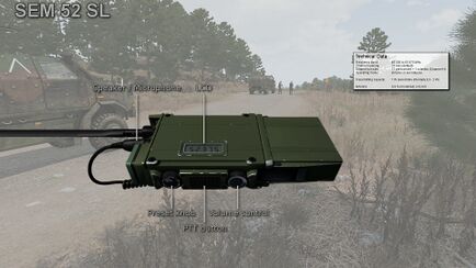 The SEM 52 SL (colloquially called "SEM52") is a 1W 1-2km radio that was issued to the German army in 1995. There is a channel preset knob on the left for selecting your channel with an accompanying LCD screen showing what the frequency is. The volume knob on the right works as one might expect and also serves to turn it off.